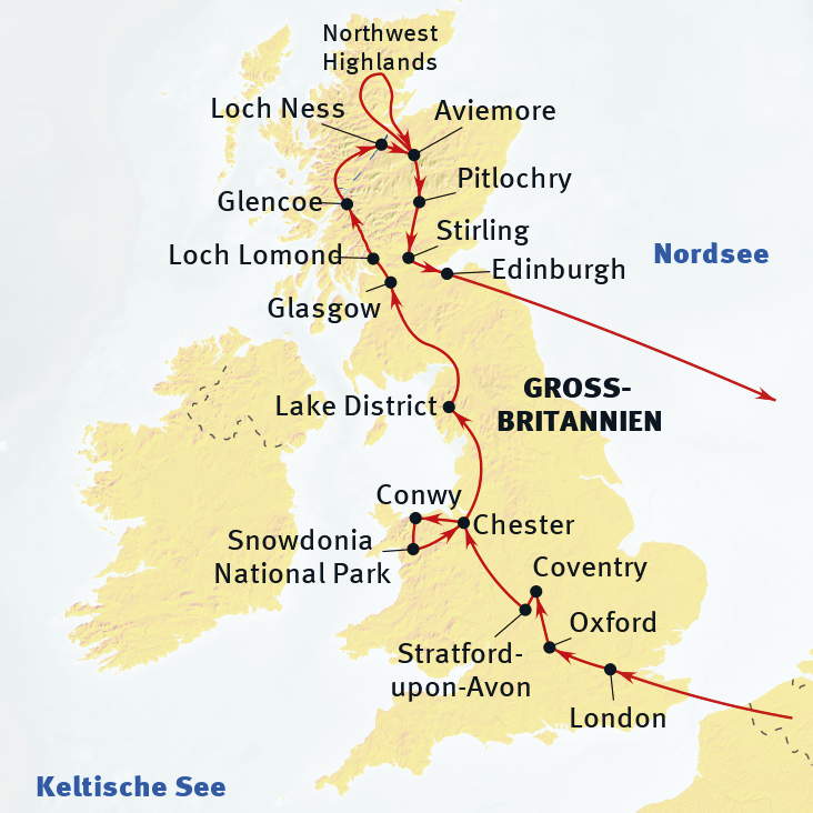 London - Oxford - Coventry - Stratford upon Avon - Chester - Snowdonia Nationalpark - Lake District - Glasgow - Loch Lomond - Glen Coe - Loch Ness - Aviemore - Highlands - Pitlochry - Stirling - Edinburgh