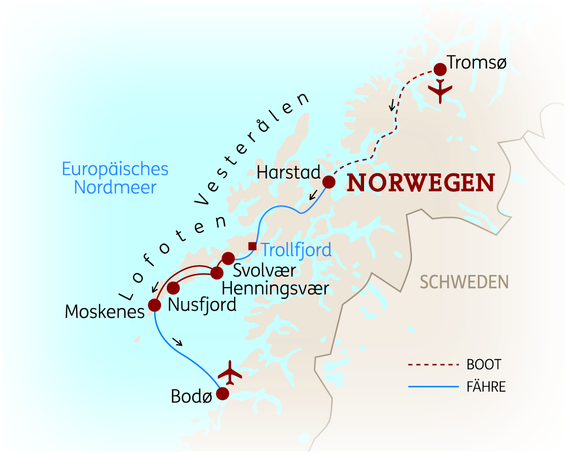 - Flug (Economy) mit Lufthansa von Frankfurt/M. (FRA) nach Tromsø (TOS) und zurück von Bodø (BOO) (inkl. Steuern & Gebühren). Sondertarif, Platzangebot begrenzt. Aufpreise möglich. Weitere Abflugorte in Deutschland, Österreich & der Schweiz auf Anfrage.
