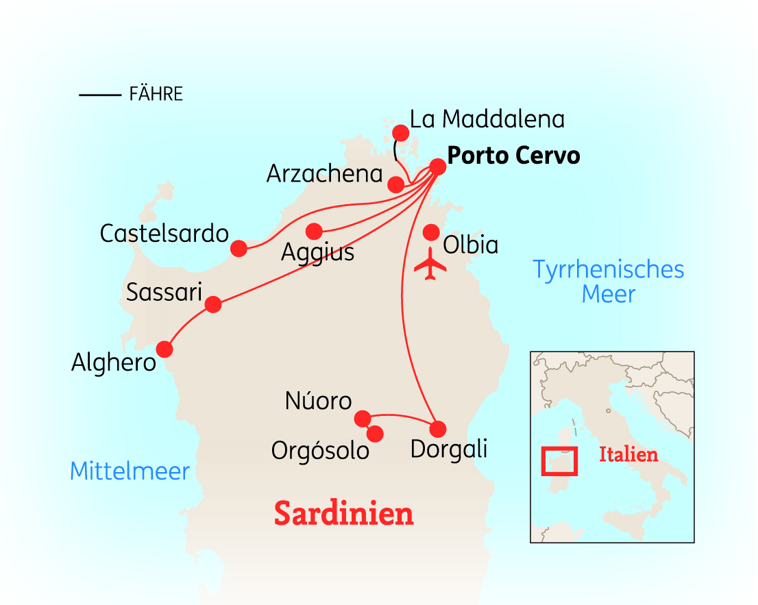 Bei einem ersten Kennenlernen mit Ihrer Reiseleitung erhalten Sie Informationen zum Programm der nächsten Tage, bevor Sie direkt mit einer ersten Tagestour starten: Ganz im Norden Sardiniens, vor der berühmten Costa Smeralda, liegt das Archipel La Maddalena mit seinen etwa 60 Inseln. Eine kurze Fährfahrt führt Sie von Palau auf die gleichnamige Hauptinsel. Diese bezaubert durch ihre landschaftliche Schönheit und ein historisches Ambiente. Über eine Brücke erreichen Sie die fast unbewohnte Insel Caprera, welche die Ruhestätte des italienischen Nationalhelden Garibaldi beherbergt. Der Guerillakämpfer aus Nizza war einer der Wegbereiter der italienischen Einigungsbewegung im 19. Jahrhundert. Gemeinsam mit Ihrer Reiseleitung besuchen Sie sein einstiges Haus und das heutige Museum. Dabei erfahren Sie, wieso Giuseppe Garibaldi auch heute noch von zahlreichen Italienern verehrt wird. Im Anschluss unternehmen Sie eine Panoramafahrt über die Insel und genießen atemberaubende Aussichten. Nach der Rückfahrt mit der Fähre gilt Ihr letzter Stopp des Tages dem Ort Porto Rafael. (F/A)