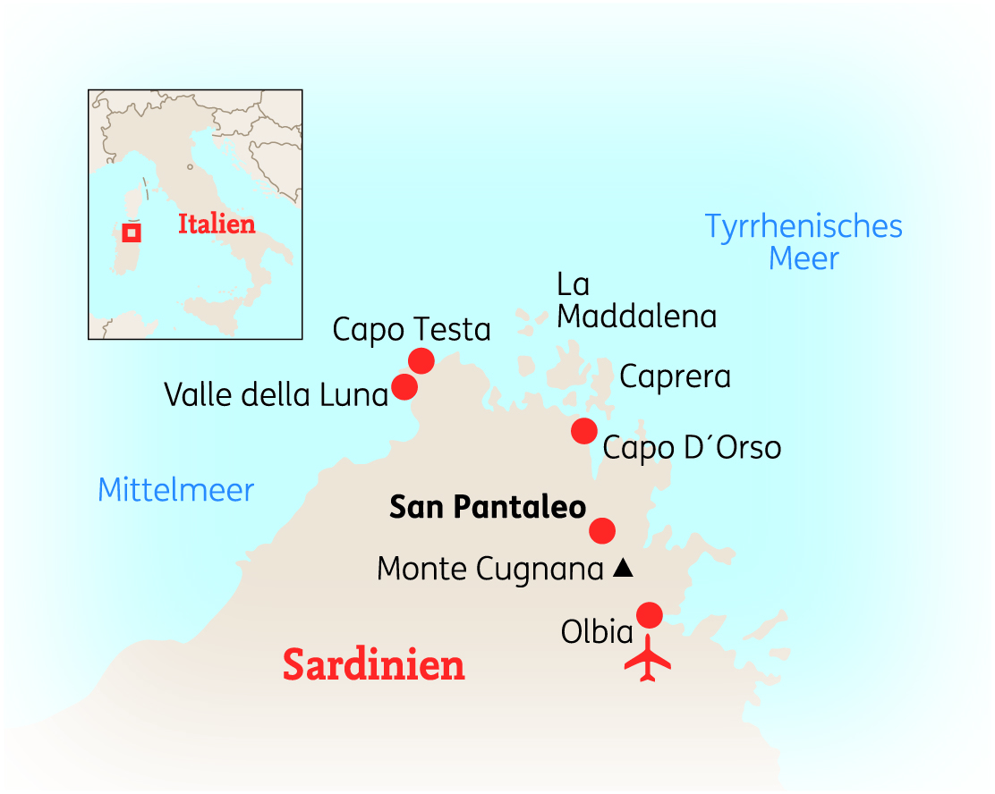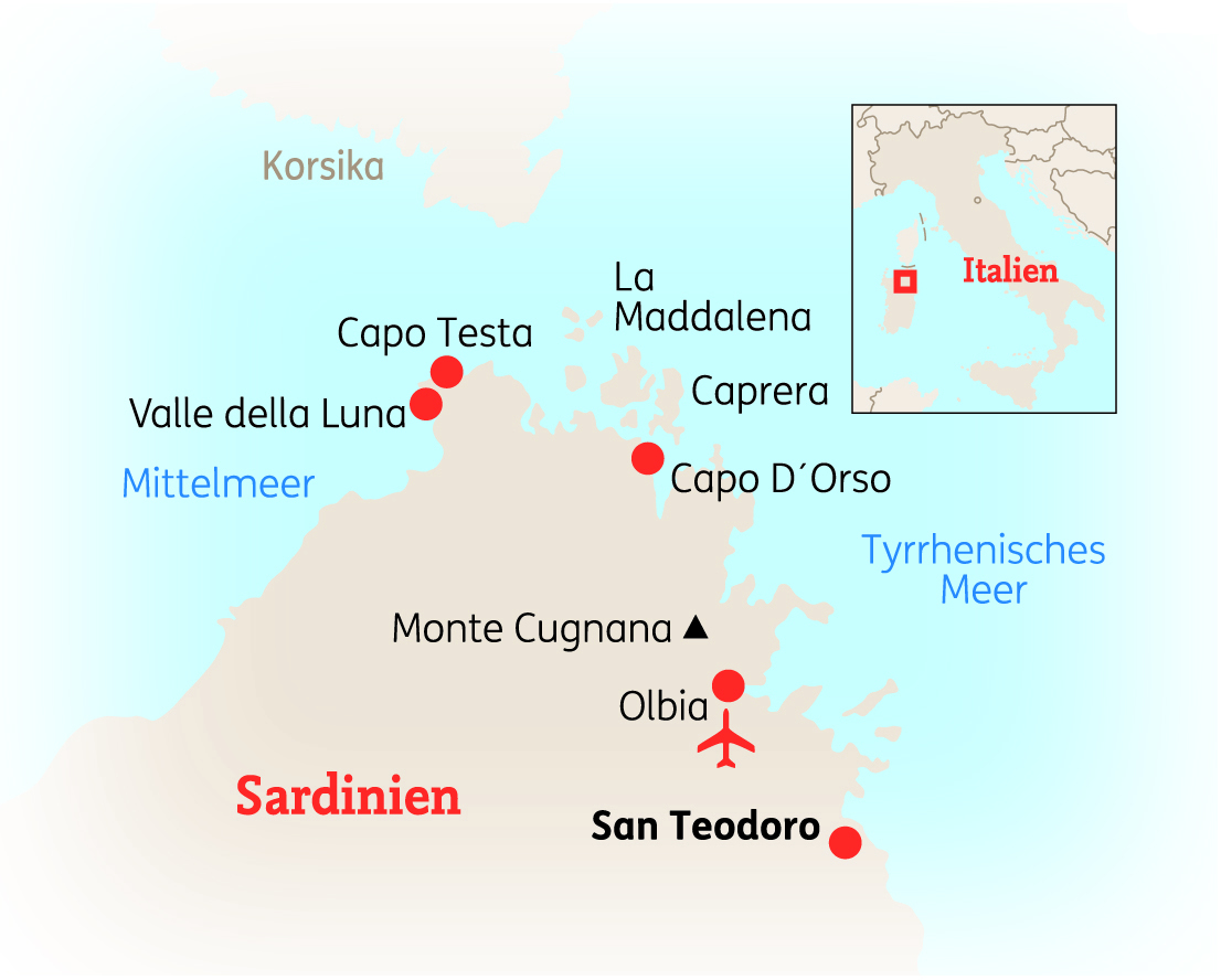 SARDINIEN - Die Küste der Mittelmeerinsel trägt den Namen „Smaragdküste“ und das zu Recht! Das Meer leuchtet tiefgrün bis türkisfarben an den feinen Sandstränden. Dahinter erstreckt sich eine verwunschene Bergwelt mit tiefen Schluchten und alten Hirtenpfaden, die sich durch Mittelmeermacchia schlängeln. Auf Ihrer 8-tägigen Reise erwarten Sie landschaftliche Vielfalt und kulinarische Höhepunkte gepaart mit sardischer Freundlichkeit.