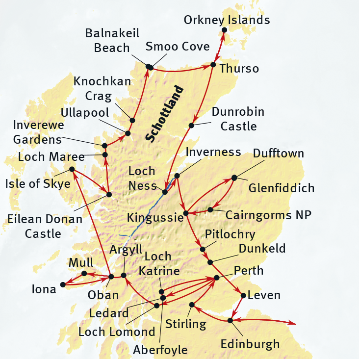 Edinburgh - Linlithgow - Stirling - Perth - Aberfoyle - Argyll - Oban - Isle of Mull - Iona - Isle of Skye - Ullapool - Thurso - Orkney - Loch Ness - Inverness - Glenfiddich - Pitlochry - Dunkeld