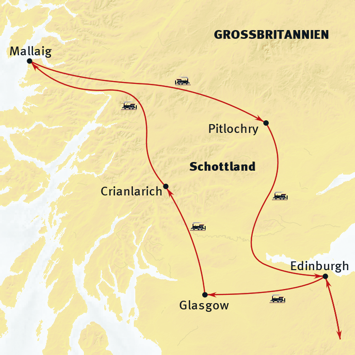 Mit der Bahn durch Schottland: Ist eine der komfortabelsten Arten zu Reisen, bereits Königin Victoria, zahlreiche Schriftsteller, Komponisten und Dichter wussten diese zu schätzen. In entspannter Atmosphäre passieren wir zerklüftete Berglandschaften, wildromantische Seen und Täler sowie Burgen und Schlösser. Magisch sind die Momente, wenn langsam der Nebel über den bezaubernden Tälern aufsteigt. Stark im Kontrast zu den Bilderbuchlandschaften Schottlands stehen die Metropolen. Die Geschichte des "dunklen" Mittelalters hat eine beachtliche Kultursubstanz hinterlassen, somit erwartet uns in Edinburgh eins der schönsten Stadtpanoramen der Welt. Die Zugfahrten geben uns auch die Gelegenheit eines authentischen Einblicks in das Alltagsleben der Schotten, die von einer ganz besonderen Art zu sein scheinen. Ganz individuell planen wir unsere Reisetage mal aktiv mit einer Wanderung auf dem West Highland Way und mal entspannt mit einem Badetag am warmen Golfstrom. Ein Besuch in einer Whiskybrennerei darf natürlich auch nicht fehlen. Am Ende bleibt uns eine rundum gelungene Reise durch Schottland.Mit der Bahn durch Schottland: Ist eine der komfortabelsten Arten zu Reisen, bereits Königin Victoria, zahlreiche Schriftsteller, Komponisten und Dichter wussten diese zu schätzen. In entspannter Atmosphäre passieren wir zerklüftete Berglandschaften, wildromantische Seen und Täler sowie Burgen und Schlösser. Magisch sind die Momente wenn langsam der Nebel über den bezaubernden Tälern aufsteigt. Stark im Kontrast zu den Bilderbuchlandschaften Schottlands stehen die Metropolen. Die Geschichte des "dunklen" Mittelalters hat eine beachtliche Kultursubstanz hinterlassen, somit erwartet uns in Edinburgh eins der schönsten Stadtpanoramen der Welt. Die Zugfahrten geben uns auch die Gelegenheit eines authentischen Einblicks in das Alltagsleben der Schotten, die von einer ganz besonderen Art zu sein scheinen. Ganz individuell planen wir unsere Reisetage mal aktiv mit einer Wanderung auf dem West Highland Way und mal entspannt mit einem Badetag am warmen Golfstrom. Ein Besuch in einer Whiskybrennerei darf natürlich auch nicht fehlen. Am Ende bleibt uns eine rundum gelungene Reise durch Schottland.